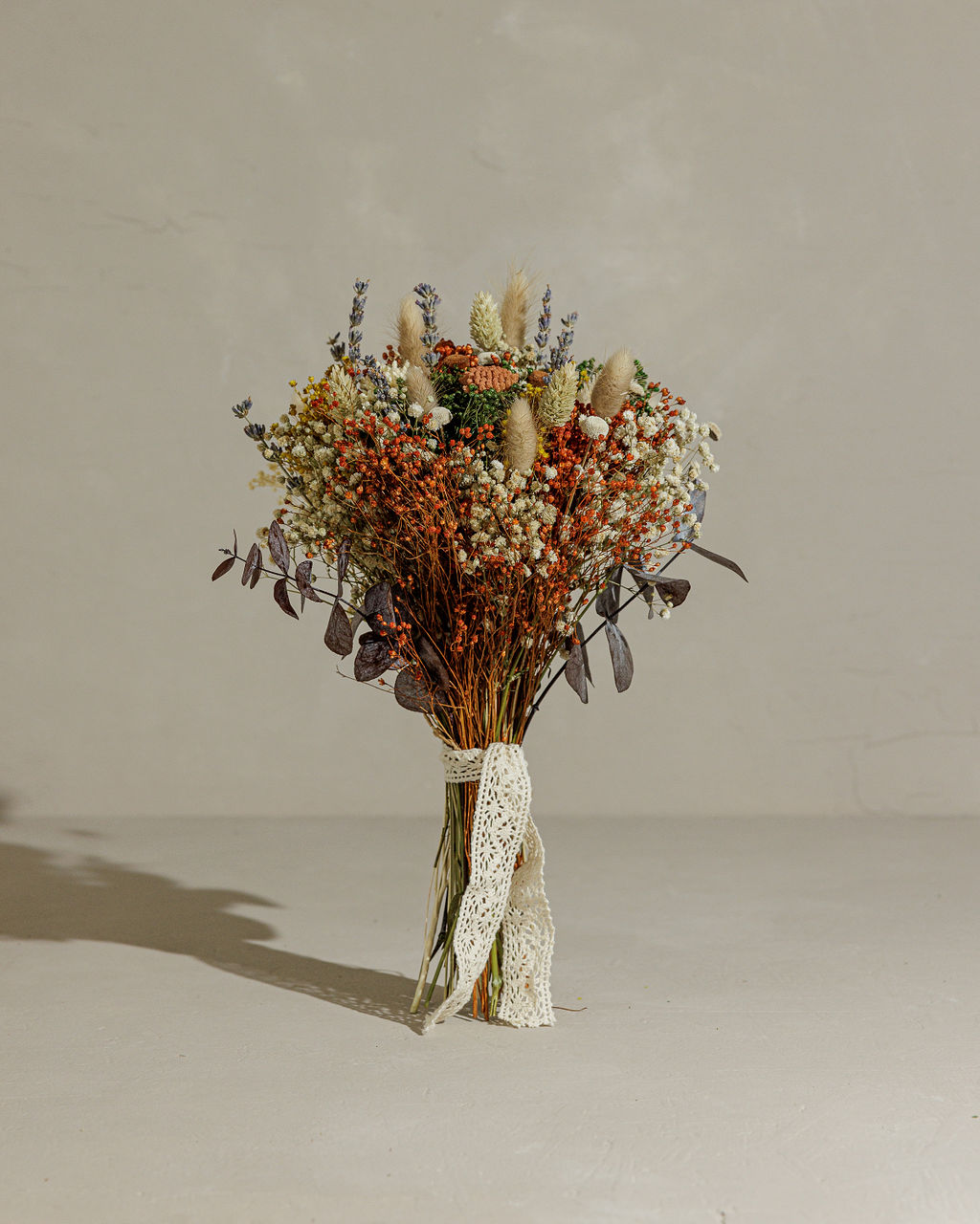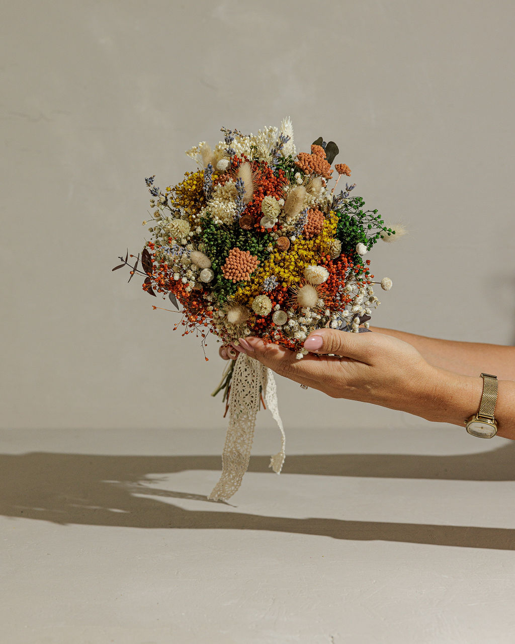 Todos os nossos ramos seguem unidos por uma fita que pode ser retirada, assim que as flores sejam colocadas no jarro, de forma a soltar o ramo, para que este possa ser manuseado. Um a um, são produzidos manualmente, com muito amor, seguindo uma composição padrão, mas com ligeiras diferenças entre eles. Por trabalharmos com flores sazonais, caso alguma não esteja disponível no momento, será substituída por outra idêntica.